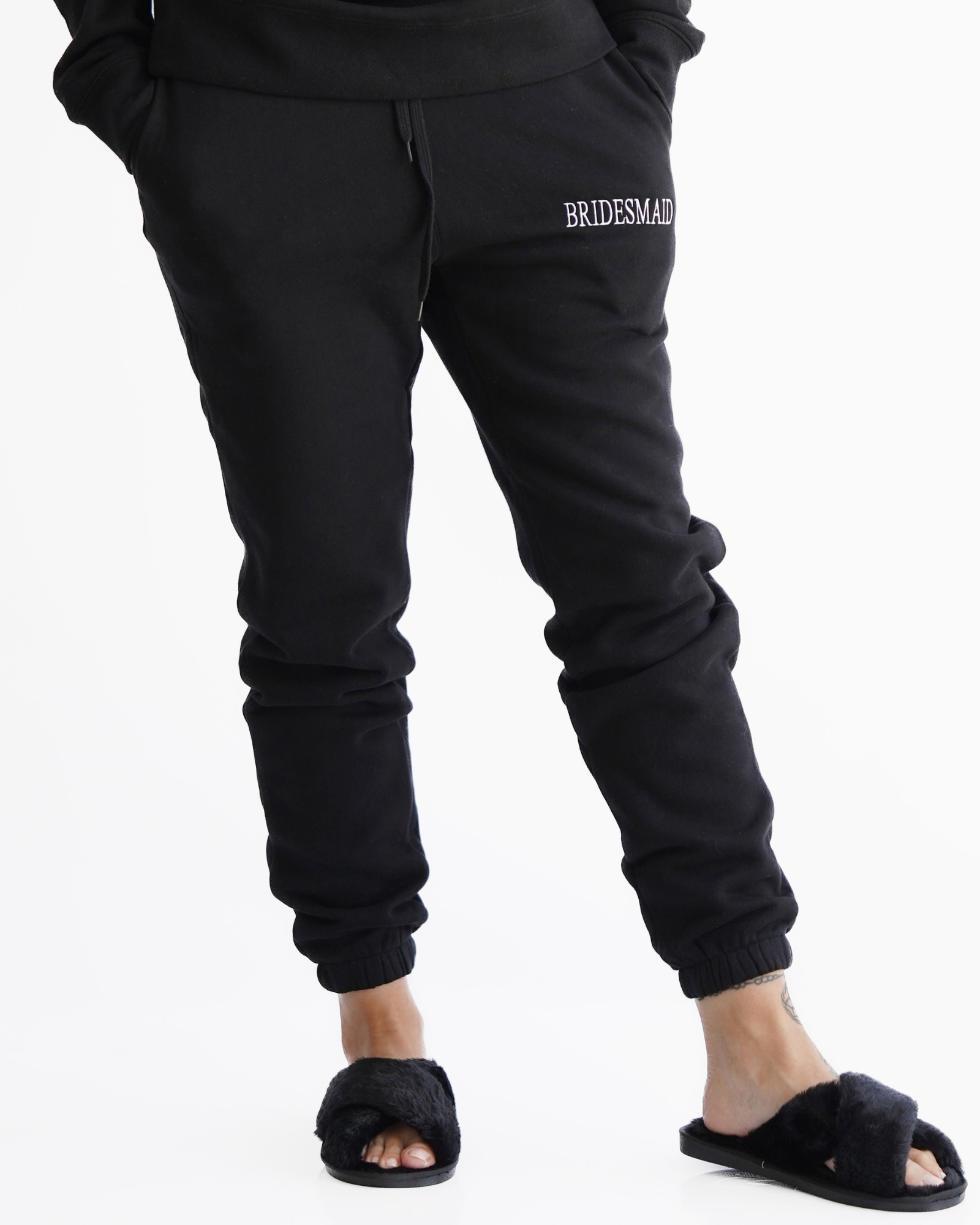 Each set consists a quarter zip crew sweater and trackpants, embroidered with the title of your bridal party in white across the chest and left pocket