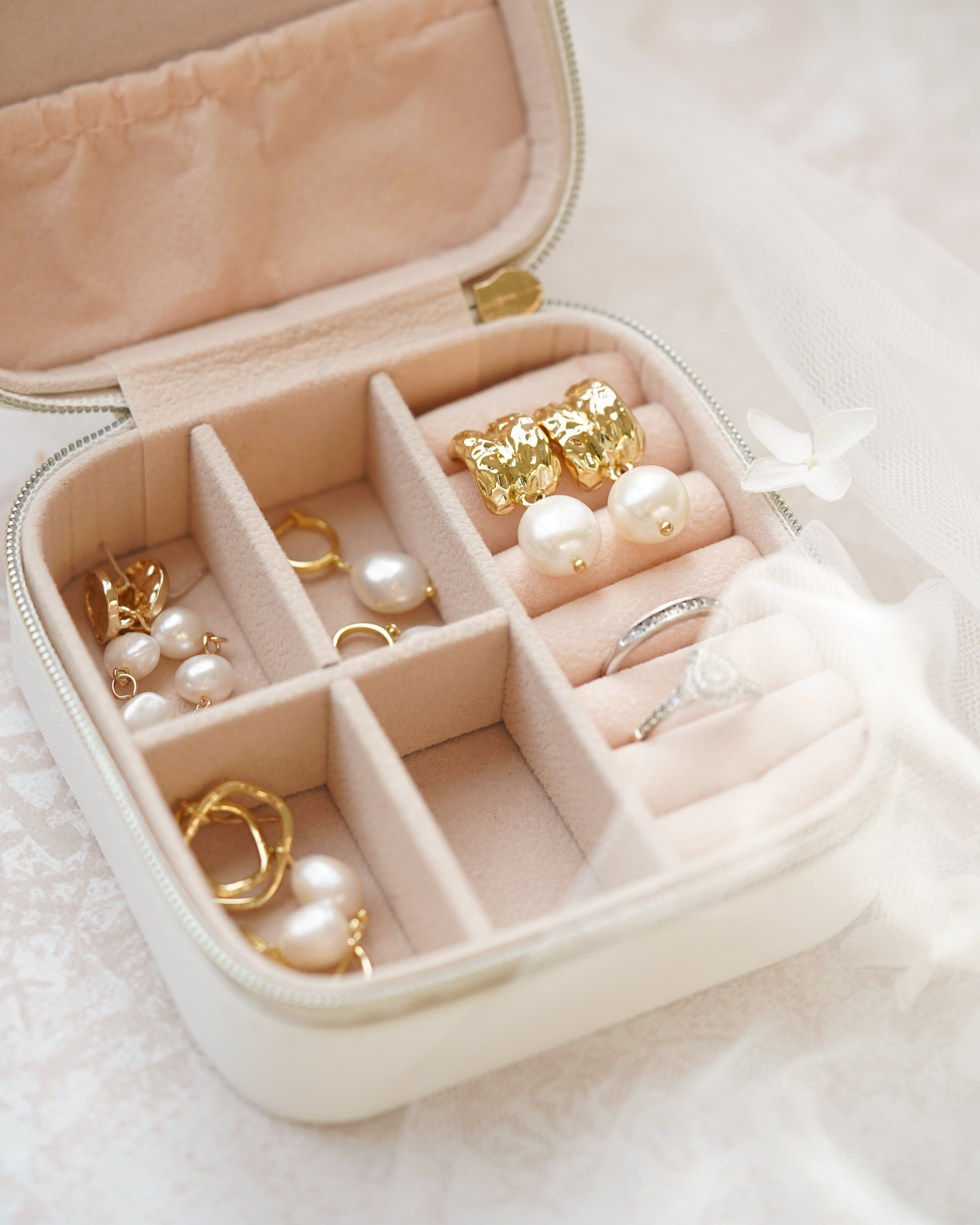 Personalise it with gold foil or blind embossing for a unique and thoughtful touch. Whether it's for a wedding, bachelorette party, or special event, this jewellery case is a memorable keepsake that your bridal party will cherish for years to come. Measuring 12cm x 12cm x 6cm, it is compact yet spacious enough to store your essential jewellery pieces securely.