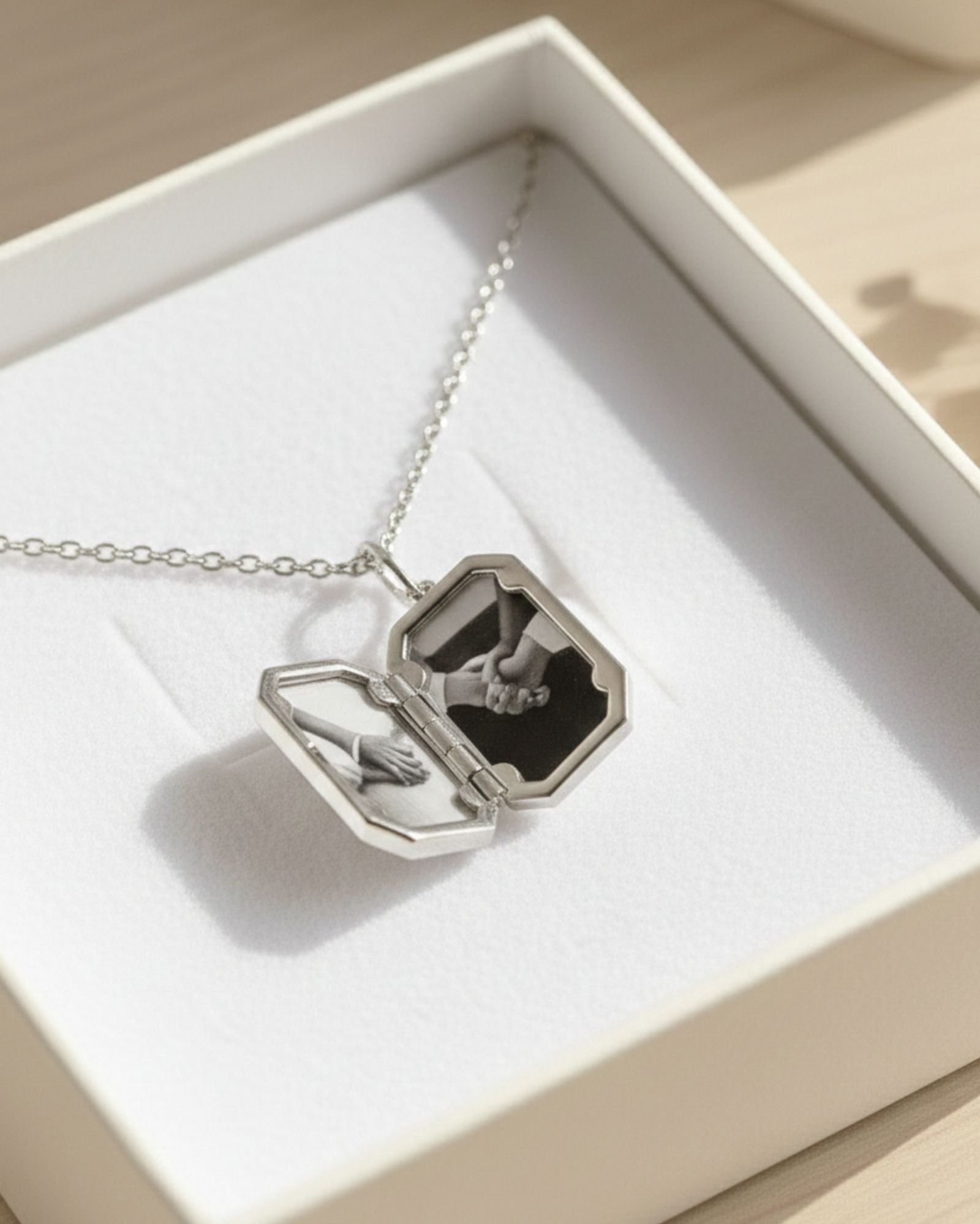 Modern and meaningful, our rectangle photo locket necklace is designed to hold a tiny black and white photo inside. This personalised locket opens to reveal a timeless keepsake, offering a contemporary shape with lasting sentimental value.