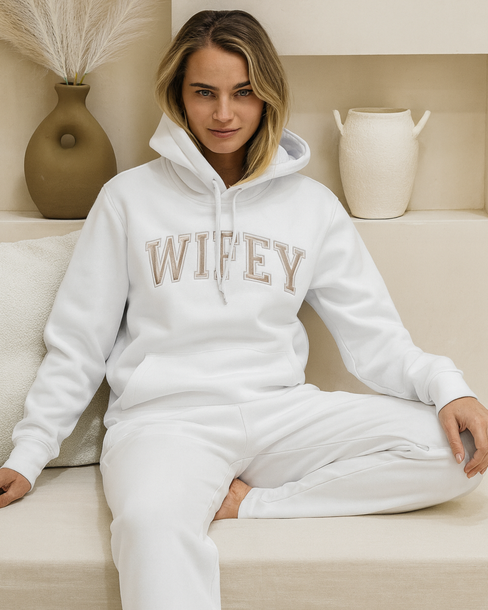Your go-to travel outfit for every newlywed. The Wifey Travel Set is a three piece bundle that includes our relaxed white tee, our embroidered white hoodie, and matching trackpants, all finished in our signature Wifey varsity embroidery. Mix and match your look by choosing your trackpant colour, while the crisp white tee and white hoodie keep the set feeling fresh. Perfect for airport runs, road trips, honeymoon travel days or throwing on between celebrations, this set is soft, comfortable and designed for an easy, relaxed fit from top to bottom.