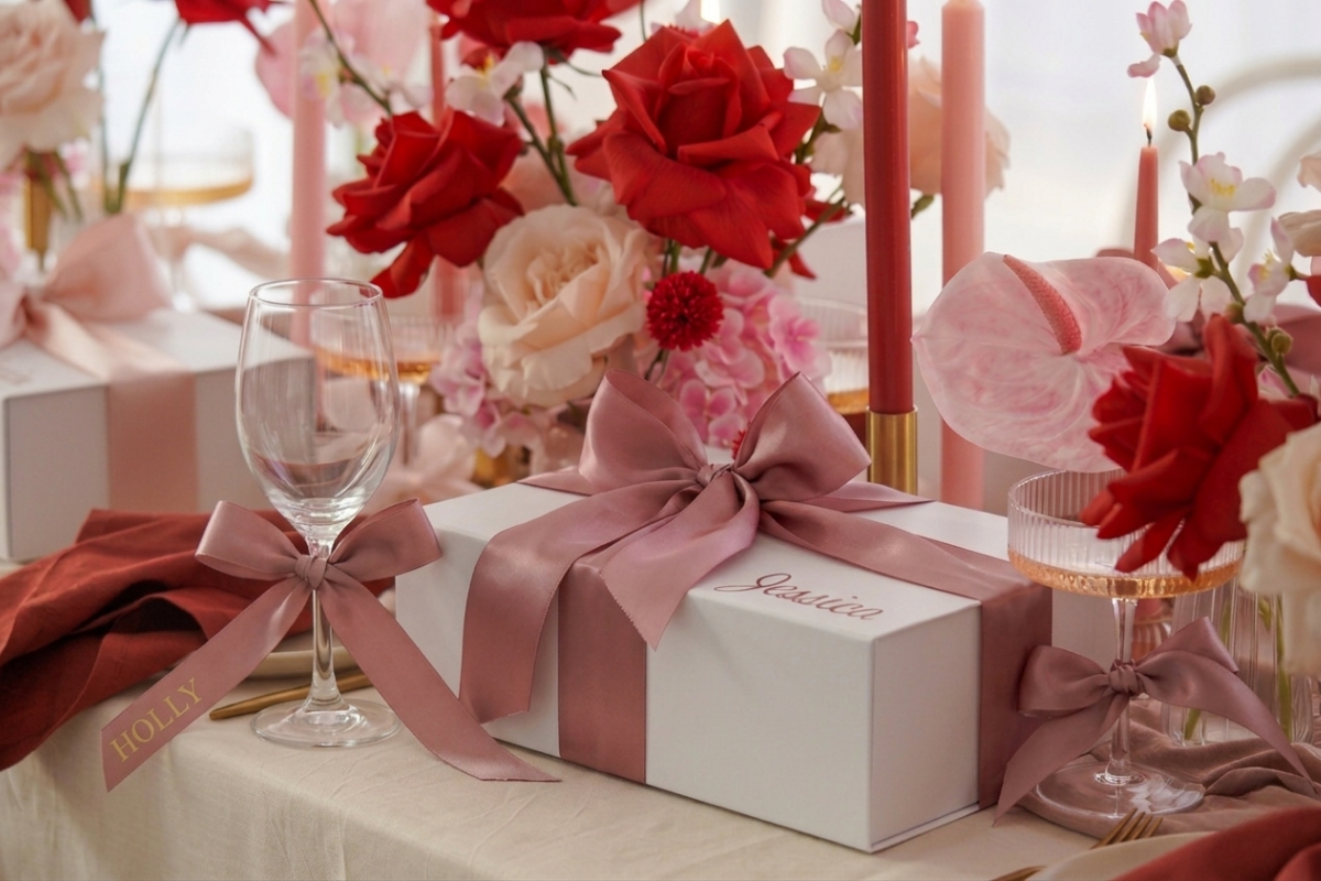 Purchase a luxury gift box and receive a free personalised glass — matched to your chosen ribbon colour and font.