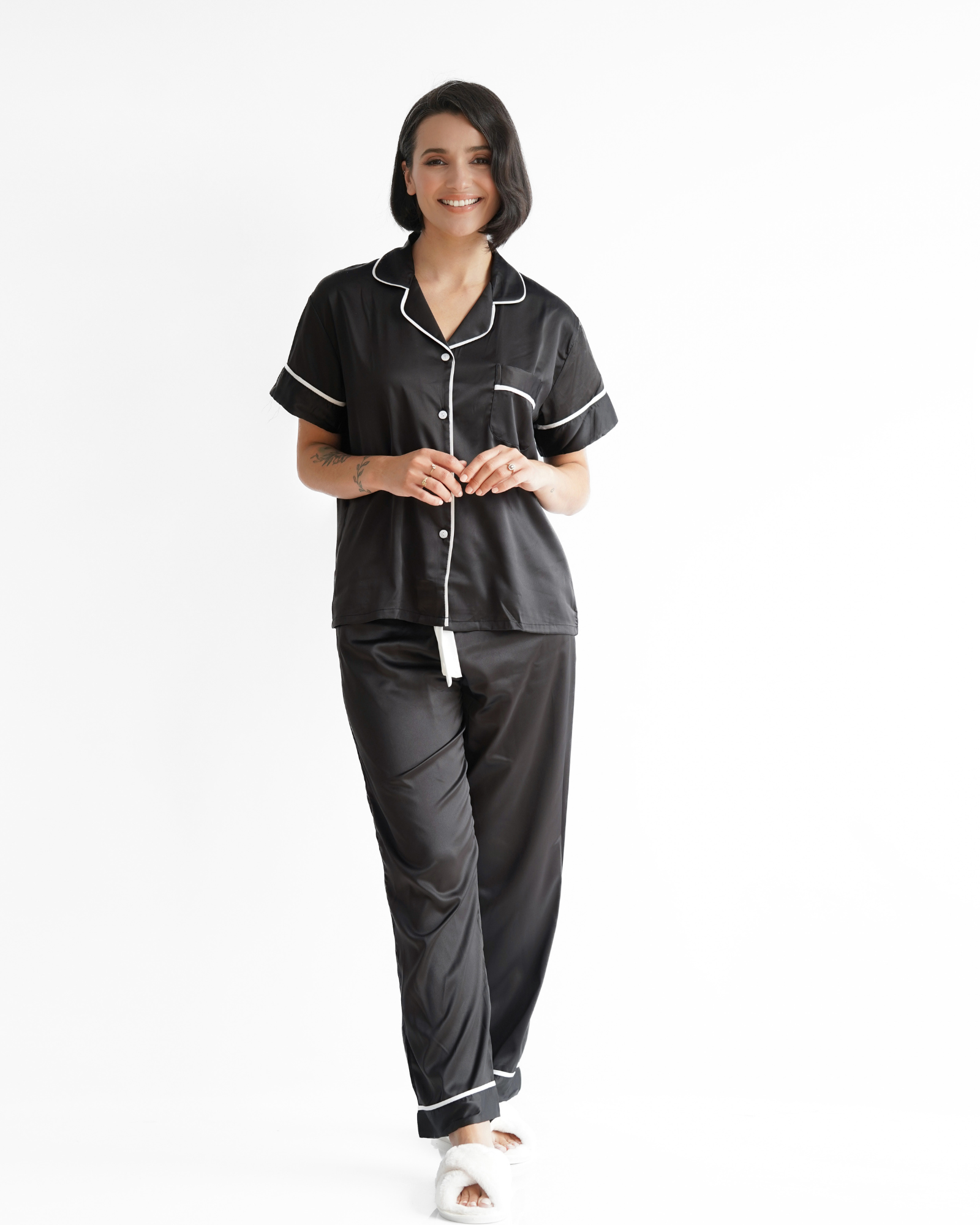 The perfect “getting ready” outfit for brides and bridesmaids, this short sleeve and long pants set combines comfort, style, and practicality. Designed with an elegant finish and thoughtful details, it’s ideal for wedding mornings, bridal party photos, or simply lounging in luxury.