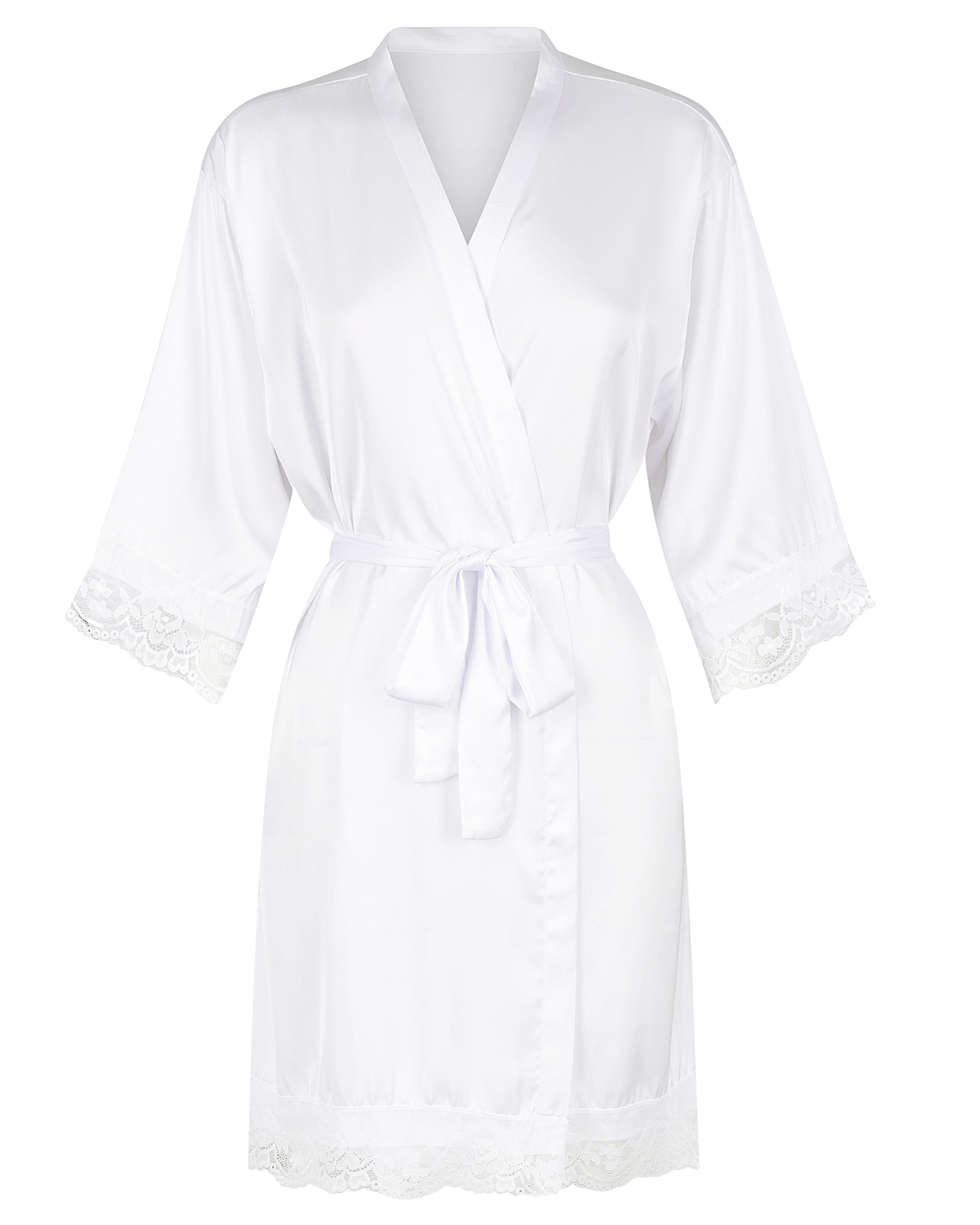 The Love Lace Satin Robe is a lightweight bridal robe with a delicate lace trim, designed for a soft and romantic look. Perfect for brides and bridesmaids who want something feminine yet comfortable, this style drapes beautifully with its satin look sheen.